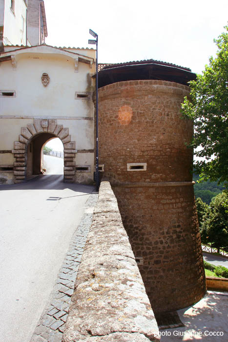Ora rasento l'imponente fianco sinistro del Palazzo Ducale, e dopo una bassa torre incontro la strada che, sottopassando una porta, tanto stretta, al punto che, si deve rispettare il senso alternato, persino a piedi, raggiungo una piazzetta a balcone, intitolata a Dante, su cui si affacciano una serie di botteghe, si aprono tre vicoli di cui quello centrale, rettilineo, porta, in ripida salita, alla sede del Comune e alla Chiesa madre che si fronteggiano creando un curioso slargo a cuneo; e un secondo, quello di sinistra, scorre esterno, tipo circonvallazione, portando alla piazza della Rocca col Palazzo Ducale, nella quale si trovano una fontana in stile viterbese, con bocchette a forma di testa di leone, su cui campeggia un galletto di bronzo simbolo di Gallese e sul fondo un Arcangelo Gabriele, monumento ai caduti.