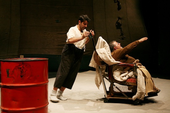 Gli sta accanto, coprotagonista, il fratello Fulvio Cauteruccio nel ruolo del servo-figlioccio Clov, il quale non può sedersi. Entrambi incatenati nel dialogo, inframmezzato da splendidi monologhi, essi “giocano” la loro partita, riproducendo in scena un conflitto reale che li affligge nel privato, un conflitto fra fratelli ma anche tra regista e attore.