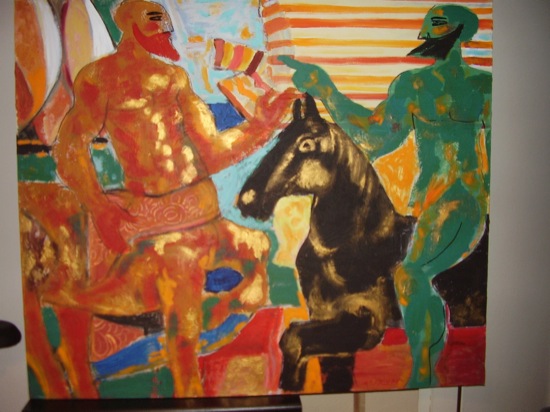 Nelle sale del Mug, alle novità si affiancano alcuni quadri sui cavalieri che provengono dalla precedente personale di Mellone, “A midsummer (K)night’s dream”, ovvero “Sogno di un cavaliere di mezza estate”, che si è tenuta a Parma, a Palazzo Giordani, sede della Provincia, tra dicembre e gennaio scorsi. Su questa esposizione così si è espressa sulla Gazzetta di Parma Manuela Bartolotti: “Ricordate il Cavaliere azzurro? Der Blaue Reiter è stato l’emblema di una generazione d’artisti e il nome della corrente espressionista tedesca sorta nel 1911, capitanata da Franz Marc e da Vassilij Kandinskij. Rivendicavano la libertà dell’immaginazione, la lotta della creatività, del colore, dell’impeto interiore contro l’accademismo. Così la figura del cavaliere ha attraversato l’arte e la storia incarnando i valori più alti dell’individuo e l’aspirazione all’utopia, al bene supremo, alla bellezza. Nelle opere del pittore parmigiano (leccese di nascita ma residente a Parma da 40 anni) e giornalista (è stato anche grafico e illustratore di punta del quotidiano «Il Giorno»), lo ritroviamo declinato nel mito e nella letteratura… Il cavaliere di Mellone, costruito con geometrie dinamiche e spigolature cubo-futuriste tra Picasso, Sironi, Marino Marini e vivacità compositive alla Cassinari, percorre i sentieri dell’arte, sfida le convenzioni superando con esuberanza cromatica e fantasia l’oscura barriera del quotidiano. In alcune immagini,… la composizione armonica e l’equilibrio tra forme e colori riconducono all’universo sereno, pacificante di Matisse. Quello che predomina però è l’irruenza coloristica e immaginifica, davvero galoppante, trascinante, come un preludio wagneriano o un canto dell’Ariosto. S’avverte la voglia di fuga, di speranza, di donchisciottesca utopia. E’ davvero allora – come dice il titolo, articolando un suggestivo gioco di parole shakespeariano – il sogno di un cavaliere di mezz’estate? Oppure è un cavaliere dei sogni? Perché è in quel territorio magico, oltre la basculante e illusoria porta della nostra realtà che egli ci vuole condurre. O semplicemente far ritornare”.