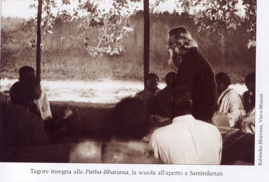 fondare nel 1901 a Santiniketan la scuola nota come la Patha-Bhavana dando il via a un nuovo modello di istruzione. Assertore della comunione uomo-natura teneva le sue lezioni all’aperto e gli allievi avevano possibilità di movimento. Era permesso esprimere se stessi attraverso la musica, la danza, l’artigianato, la recitazione, il gioco, i colori. Un giorno a settimana avevano luogo gli incontri letterari: lettura ad alta voce dei scritti degli allievi, teatro, uso del corpo.
