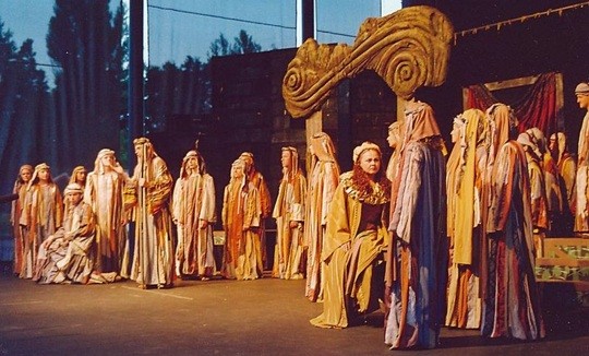 È una visione abbacinante quella che subito, a scena aperta e a luce piena, si presenta ai nostri occhi entrando in teatro. Un vasto prato verde con al centro un grande tronco d’albero che si slancia nascondendo la sua altezza.