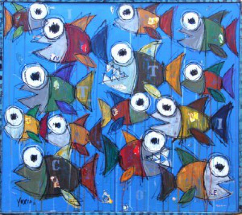 Un altro filone esposto ĆØ quello dedicato alla rappresentazione dei pesci e dei germani: animali raffigurati sempre in branco, con grandi occhi e manti multi colore, come fossero dei viaggiatori āurbaniā che invadono con caotica ironia il nostro contemporaneo. In una sezione della mostra saranno presentati in esclusiva dalla galleria i particolari retouchĆ©, grafiche tratte da opere uniche, che vengono ritoccate a mano dall'artista.