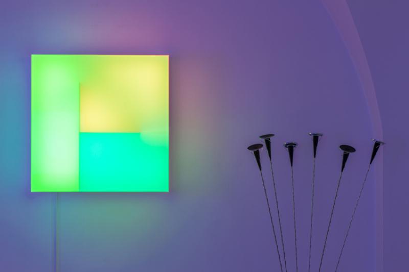 Lo spazio espositivo assume i connotati di un’unica grande installazione marcata da tre elementi scenici: sulle pareti attirano lo sguardo forme luminose quadrangolari chiamate light box dove una luce a led - generata e dinamizzata da un software con l’ausilio di una chiave USB - gioca fantasiosamente su una struttura composta di perspex e materiale ligneo: l’effetto è quello di un dipinto di luce colto nell’atto del suo farsi; inoltre, delle stampe digitali lenticolari su plastica traslucida PETG (quelle immagini che mutano a seconda del punto di osservazione per intenderci…vecchi ricordi d’infanzia); e poi, sparsi qua e là , mazzi di speaker flower: fiori composti da piccoli altoparlanti, ciascuno dei quali produce un differente motivo sonoro, sostenuti da lunghi steli metallici che reagiscono al suono oscillando.