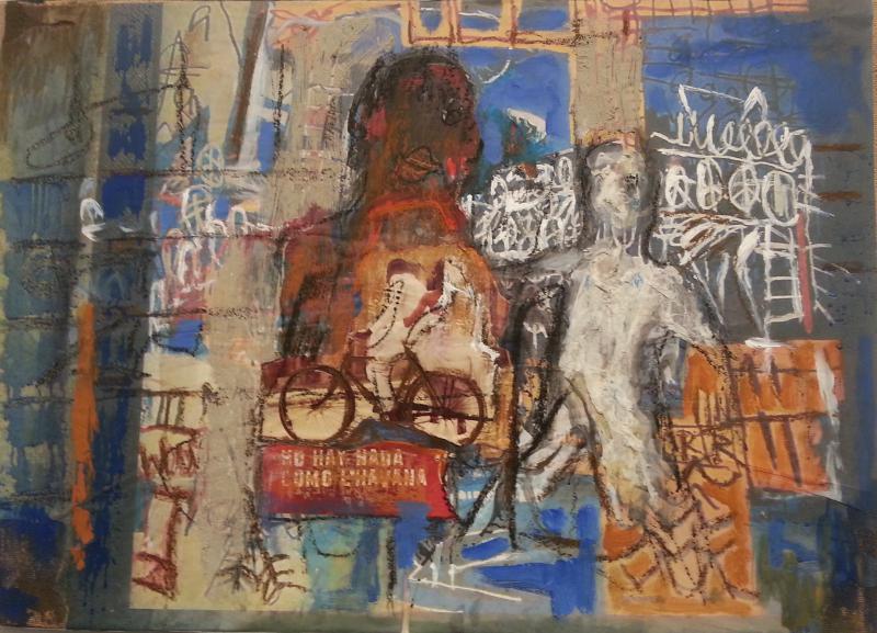 Macchie di vivaci colori e apparentemente incerte pennellate, evidenziano figure sospese nell’irreale. Geometrie pittoriche in contrasto per sottolineare la profondità di una rivelazione sociale che si esprime con forza oltre il segno. Eco di lontane oceaniche rivolte, di contestazioni sfumate nella incapacità di concretezza, di utopistiche elaborazioni filosofiche…oggi confessano sui muri quelle sconfitte e al contempo mantengono vive ed intere tutte le aspirazioni di una gioventù ancorata alla realtà di un mondo sfuggente ma determinata ad affermare con forme di artistica fantasia una rinnovata prospettiva di vita.