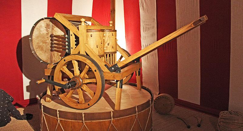 Si parte da un antenato della musica meccanica, fatto per scandire ritmi e cadenze in modo ‘geometrico’: è il Tamburo di guerra di Leonardo Da Vinci, ospitato in una tenda da guerra del ‘500.