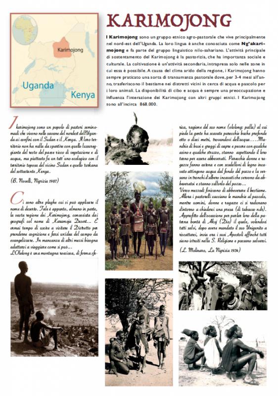Ci sono altre plaghe cui si può applicare il nome di deserto. Tale è appunto, almeno in parte, la vasta regione dei Karamajong, conosciuta dai geografi col nome di Karamajon Desert….E' ormai tempo di uscire a visitare il Distretto per prenderne cognizione e farsi un'idea del campo da evangelizzare. In mancanza di altri mezzi bisogna adattarsi a viaggiare come si può…. L'Ololong è una montagna rocciosa, di forma sferica, ragione del suo nome (ololong: palla) al cui piede la gente ha scavate parecchie buche profonde otto o dieci metri, trovandovi dell'acqua….Mandrie di buoi e greggi di capre e pecore con qualche asino e qualche struzzo, stanno aspettando il loro turno per essere abbeverati. Parecchie donne e ragazze fanno catena e con scodelloni di legno incavato attingono acqua dal fondo del pozzo e la versano in tronchi d'albero incavati che servono da abbeveratoi e stanno sull'orlo del pozzo… Verso mezzodì finiscono di abbeverare il bestiame. Allora i pastorelli cacciano le mandrie al pascolo, mentre uomini, donne e ragazze ci si radunano d'intorno a chiederci una presa (di tabacco ndr). Approfitto dell'occasione per parlar loro della paterna bontà di Akuj (Dio) il quale, volendoci tutti salvi, dopo avere mandato il suo Unigenito a riscattarci, invia ora i suoi Apostoli affinché tutti siano istruiti nella S. Religione e possano salvarsi. (L. Molinaro, La Nigrizia 1934)