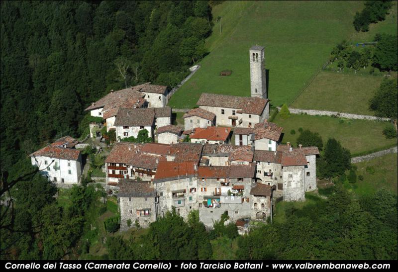 Ma per capire meglio occorre fare un passo indietro nella storia. Nel medioevo infatti era una vivace stazione di sosta lungo la Via Mercatorum che, attraverso la Val Brembana, collegava Bergamo e la pianura alla Valtellina e i Grigioni. I mercanti salivano fin qui a piedi o a cavallo, vi tenevano il mercato e ripartivano con armi e bagagli alla volta di passo S.Marco. Cornello era una sosta d'obbligo tra la media e l'alta valle Brembana che portava al Passo della Forcella e di lì a Lecco e i laghi. Ma l'antica via era scomoda e faticosa e i Veneziani pensarono di costruire una strada migliore a fondovalle. Il progetto fu portato a termine alla fine del XVI secolo e tagliò fuori Cornello, determinando il suo isolamento e l'inevitabile decadenza. Una magra fine, se vogliamo, ma questo evento ha conservato il borgo come era, le case dai tratti rustici, la via porticata che serviva per la sosta dei cavalli, la chiesetta con i suoi affreschi del '400, e la bella dimora dei Tasso, questi ultimi, la vera gloria di Cornello dei Tasso. La famiglia alla quale apparteneva il poeta Torquato è infatti originaria di qui. All'inizio, come i loro conterranei, erano poveri in canna e nemmeno di buona costituzione fisica. Così mentre i montanari forzuti emigravano alla volta di Genova e Venezia, loro si dedicavano al terziario organizzando il servizio di posta nella valle. Già attivi nel XIII secolo, i Tasso fanno capo a Omodeo, segnalato in documenti della seconda metà del secolo come abitante del Cornello. Nel corso del Quattrocento alcuni dei suoi discendenti si trasferirono a Venezia, dove si distinsero nella Compagnia di Corrieri Veneti che gestiva i collegamenti con le città italiane. Alla fine del Quattrocento li troviamo in Tirolo e nelle Fiandre, al servizio degli Asburgo e agli inizi del Cinquecento, con una serie di convenzioni con il governo, furono nominati mastri generali delle poste imperiali.