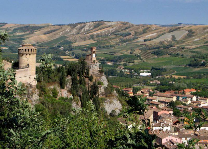 Altri 17 chilometri e siamo a Brisighella senza fatica: abbiamo attraversato i borghi di Santa Lucia, i crinali di Pian di Vicchio, i calanchi e i campi coltivati… Brisighella è un antico borgo medievale e termale della Valle del Lamone, nell’Appennino Tosco-Romagnolo, lo caratterizzano tre pinnacoli rocciosi, i famosi tre colli, su cui poggiano la Rocca Manfrediana ( sec. XIV), il santuario del Monticino (secolo XVIII), la Torre detta dell’Orologio (sec. XIX). La tranquillità che regna nel borgo e nei dintorni ne fanno il luogo ideale per abbandonare ogni stress e dedicarsi alla cura di sè stessi. Un mare di verde, sentieri e scalinate gessosi, antichi luoghi di culto, case poste in strade caratteristiche…. tutto a Brisighella crea un insieme di sensazioni e di esperienze uniche, che suscitano ricordi ancestrali di un mondo lontano, e che sono valse per il riconoscimento di uno dei “Borghi più belli d’Italia”.