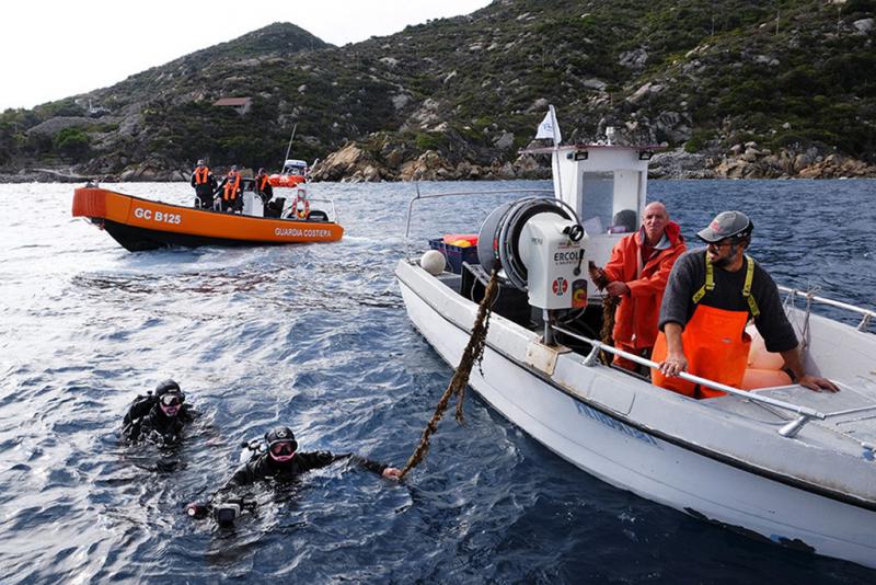 I sub che hanno eseguito le due operazioni erano: Gianmaria Vettore, Claudia Di Giuseppe, Fabio Forti, Graziano Lanini della Associazione Underwater Pro Tour (UPT) mentre Gianluca Mancini, biologo del progetto posidonie dell’università La Sapienza ha partecipato solo al recupero della rete, facendo rilevamenti scientifici e video. Mentre in superficie Francesco Dietrich e Walter Monterastelli della Cooperativa di Comunità Laudato Sì, con il loro peschereccio dotato di argano, hanno issato dal fondale la rete. Domenico Battistello era lo skipper dell’imbarcazione dei sub “Ladybird”. La Guardia Costiera*** dell’Isola del Giglio, sempre disponibile a prestare la sua collaborazione, ha fornito l’assistenza e la sicurezza necessaria con imbarcazione ed equipaggio.