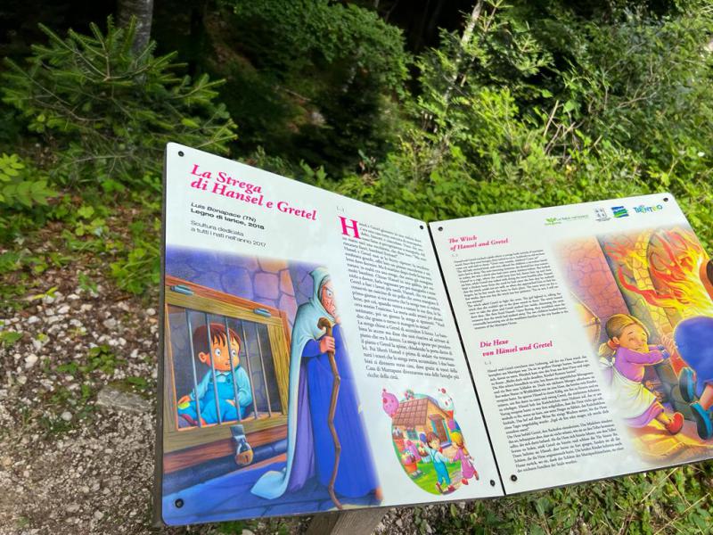 Questo sentiero è nato nel 2020 e si snoda su un percorso fresco e ombreggiato. Camminando si possono ammirare sculture in legno, realizzate da numerosi artisti, che rappresentano i protagonisti delle fiabe classiche o delle leggende locali. Di fianco ad ogni scultura ho potuto apprendere da fogli illustrati la storia di ogni singolo personaggio.