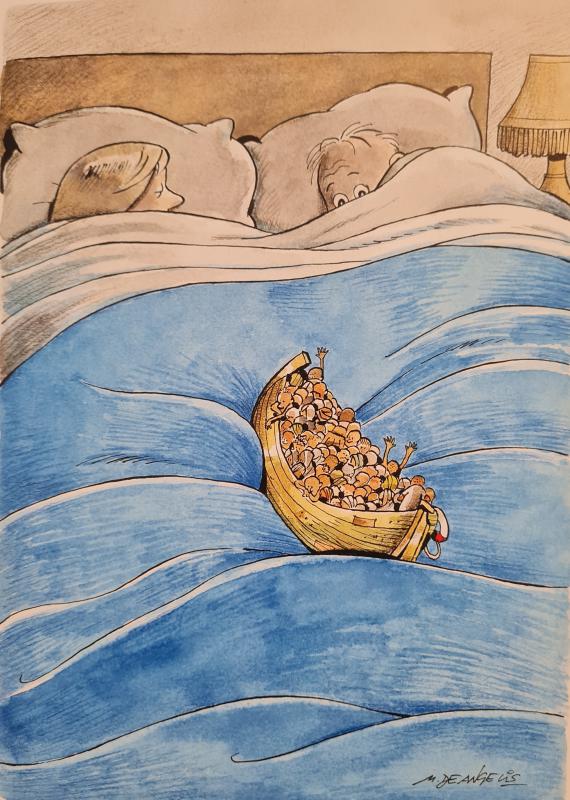 Senza mai perdere il sorriso per l'arguta didattica umoristica che connota, caratterizza e distingue questo versatile autore, non si può non inghiottire un mozzato respiro... e una misteriosa mano sembra stringere il cuore di fronte al messaggio - chiaro ed esplicido - che lievi linee di matita e colori appropriati espandono.